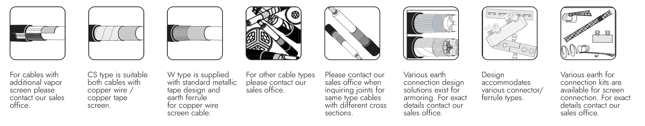 The electrical continuity of the screen (both Cu tape or Cu wire) is ensured by a tinned copper stocking with roll force springs (CS type) or for Cu wire with a standard tinned copper tape plus an earthing ferrule (W type).