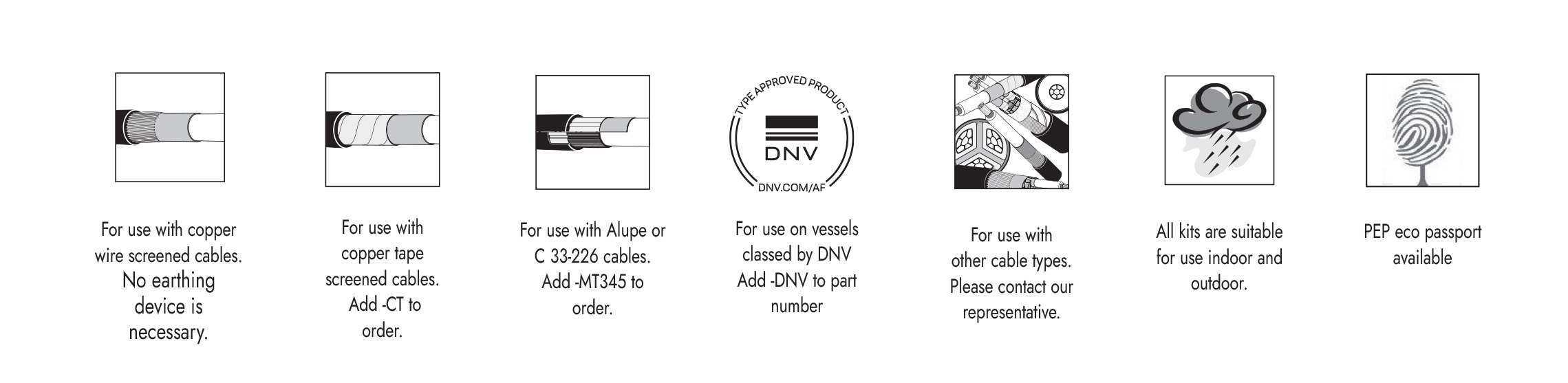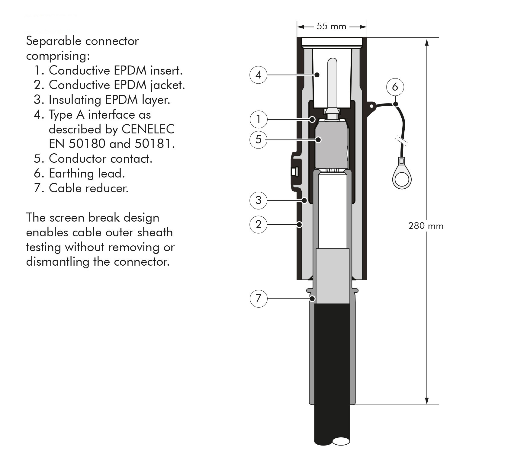 - The thick conductive EPDM jacket provides a total safe to touch screen which ensures safety for personnel.