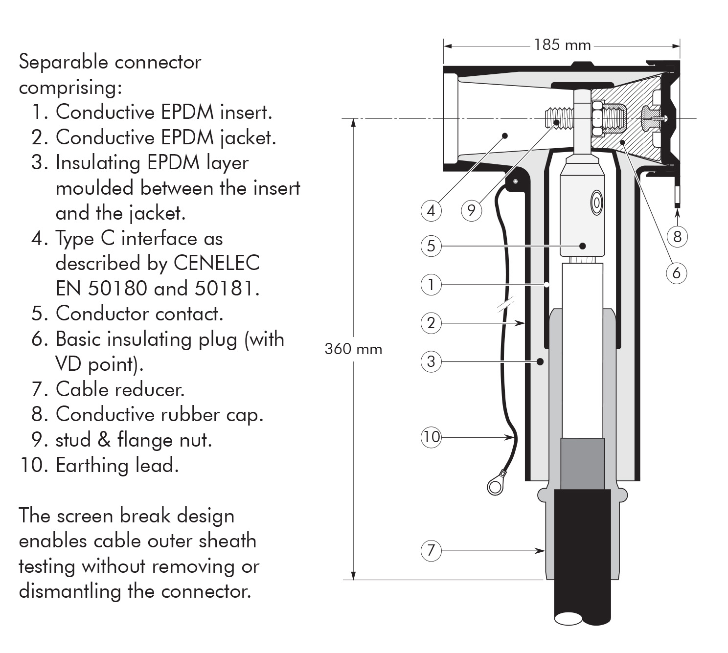 - The thick conductive EPDM jacket provides a total safe to touch screen which ensures safety for personnel.