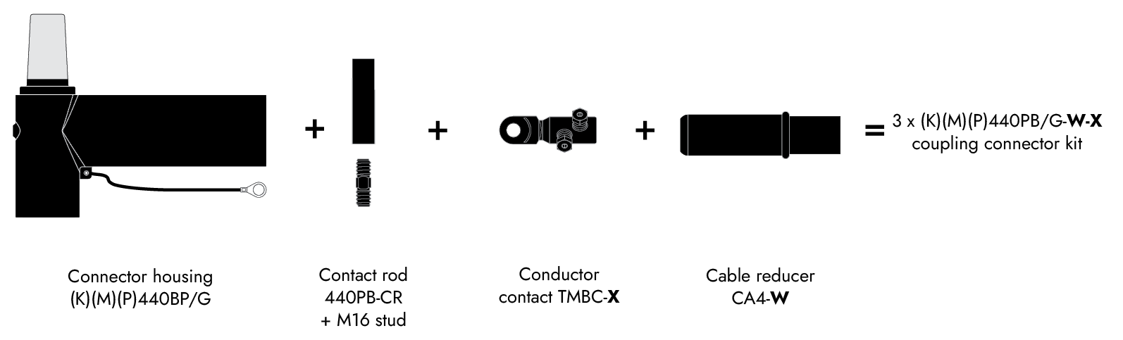 - (K) / (M) / (P) correspond respectively to connectors compatible for 24 kV / 36 kV / 42 kV voltages.