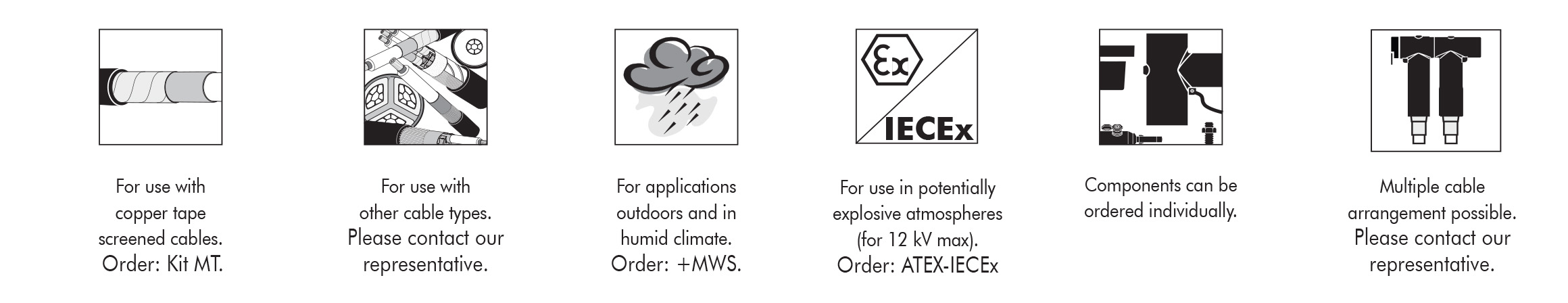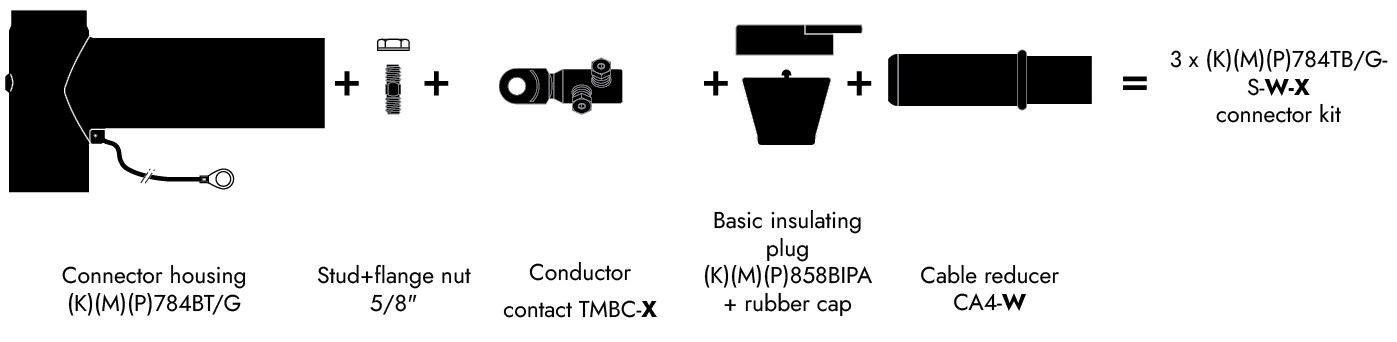 - (K) / (M) / (P) correspond respectively to connectors compatible for 24 kV / 36 kV / 42 kV voltages.