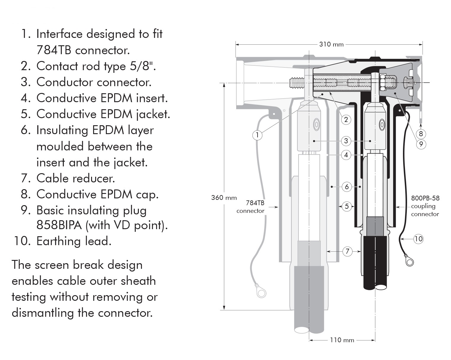 Separable coupling connector (bolted type) for dual cable arrangement. It has been designed to be used with 784TB separable tee connector.