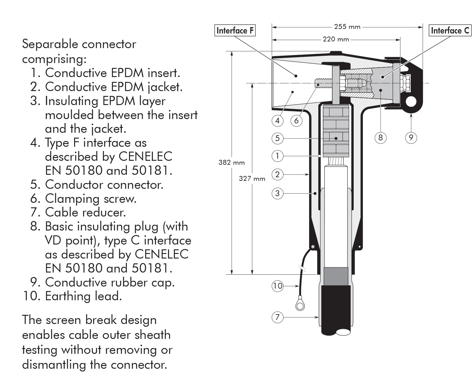 - The thick conductive EPDM jacket provides a total safe to touch screen which ensures safety for personnel.