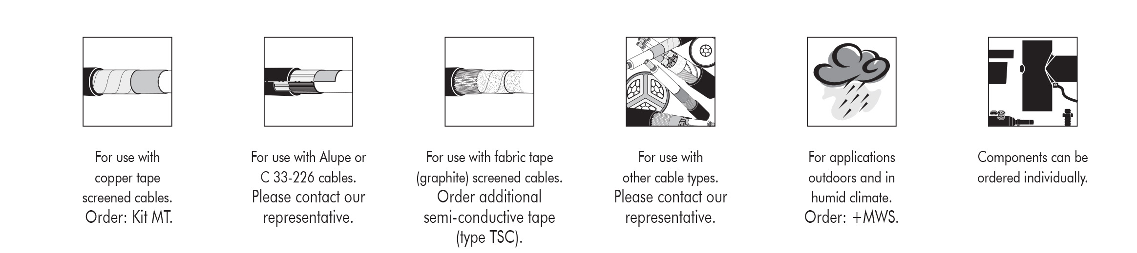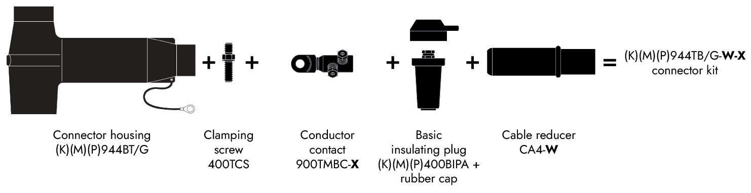 - (K) / (M) / (P) correspond respectively to connectors compatible for 24 kV / 36 kV / 42 kV voltages.