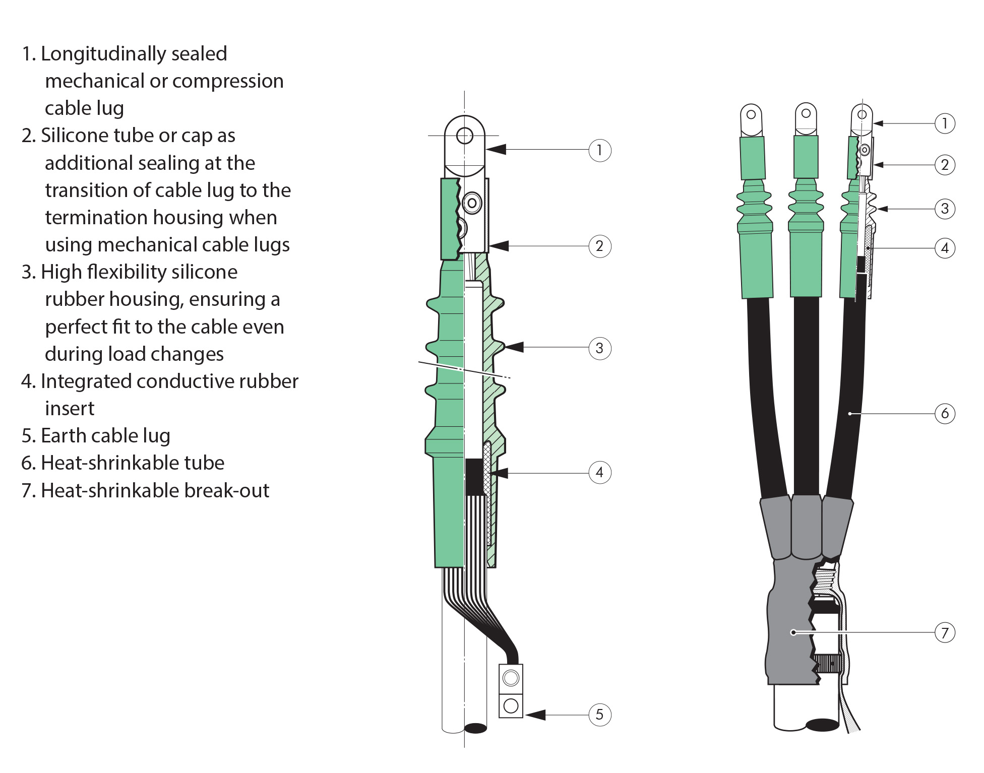 A basic kit always comprises 3 termination housings, the installation instructions. Cable lugs, earthing lugs and water sealing sleeves are not inluded in the basic kit but can be ordered separatly.