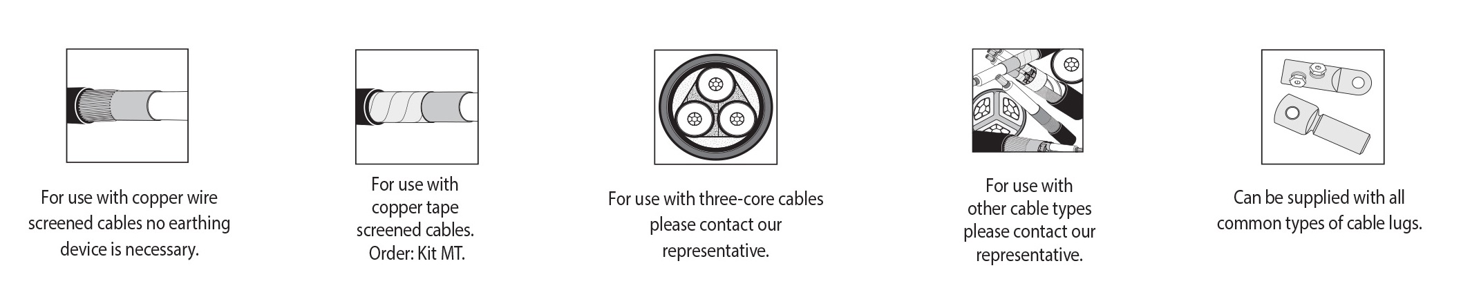 A kit of 3 terminations for use indoors in controlled environmental conditions and subject to light condensation. They provide a simple and quick method of stress relieving on screened polymeric cables.